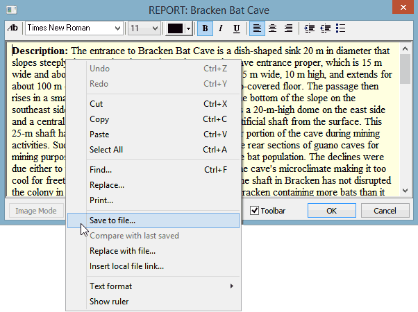 While relatively basic in capability, the editor does allow switching between plain text and rich text formats, the latter being compatible with programs like WordPad and Microsoft Word. It also has a Save to file function that creates a file with the appropriate extension -- either txt or rtf. The suggested output file name in the save dialog will be of the form "Texas Public Caves_#2_REPORT-Bracken Bat Cave.rtf." Note that the shapefile name, record number, field name, and record label is represented in this name, which of course you can change.
