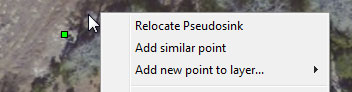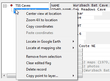 Besides point relocation, the pop-up menu offers the choice of creating a new point with attributes initialized to have the same values as the highlighted point. To create a new point with blank attribute values, highlight a root of the tree (the shapefile's title) before right-clicking on the map.