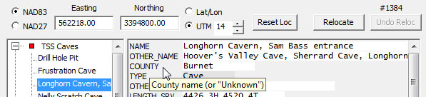 As you click Relocate, examine the map view. If the feature's marker moves to a place you like better, you may have corrected a set of UTM coordinates for which WGS84 was wrongly assumed. In Central Texas the placemark will have shifted 205 meters north and 35 meters west. Here you're checking the possibility that UTM coordinates were tagged with the wrong datum. Perhaps surprisingly, the size of the location shift is different when testing a datum assigned to Lat/Long coordinates. For locations in Central Texas, changing a Lat/Long datum from NAD83 to NAD27 will shift the placemark 25 meters north and 30 meters west. Of course, with either coordinate type, correcting a mistaken NAD27 assumption will produce a shift in the opposite direction. When neither the original coordinate type or the "direction" of the suspected datum error is known, you may want to test all four possibilities while examining the map's imagery.