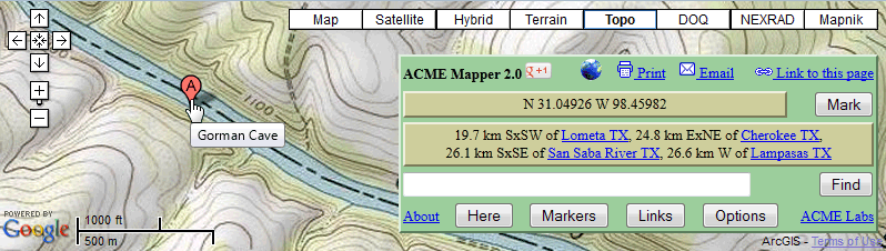 • Center a Web Mapping Application at a Point: Another context menu choice is to open a web mapping application in your browser, centered on the point or feature you've chosen. This can be faster and more informative than using Google Earth when the goal is to inspect the roads, towns, and terrain surrounding a single generated placemark. A Preferences menu item named URL for Web Map Navigation lets you specify which application to open and what kind of map to initially display. The application that's set up by default is Acme Mapper. In addition to providing Google's standard map views, both it and a similar application, Gmap4, can display GIS data of several different kinds. It also has an interface that's convenient for grabbing coordinates for use in WallsMap, either for establishing new features or for placing persistent marks on the map view (see next item). Only a single copy/paste operation is needed.