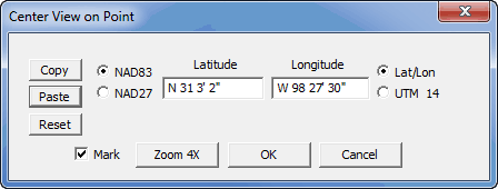 •Center the Map or Capture Coordinates: An operation you'll likely perform often is navigating to a specific location on your map using a set of coordinates you've copied to the Windows clipboard from some source. For example, it could be the set N 31.04926 W 98.45982 shown above, or some other format the program recognizes, such as N 31 2' 57" W 98 27' 35". Open the Center View on Point dialog by either clicking a toolbar button (crosshair icon) or by right-clicking a point on the map and selecting that option from the context menu: