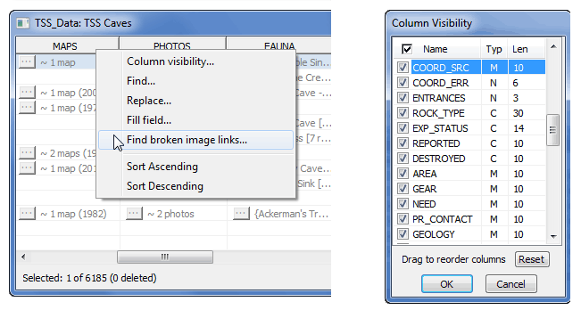 The table header's context menu offers fill and replace functions, a test for broken links in memo fields, and a quick way to rearrange or hide columns (apart from direct dragging), which can be useful when exporting either shapefiles or spreadsheets: