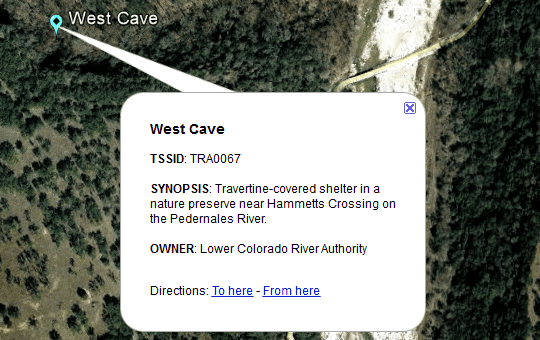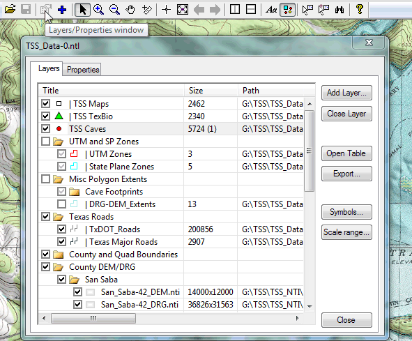 When a layer is highlighted (see TSS Caves above), two buttons on the right panel open dialogs for fine tuning how the layer's information is processed. A Symbols dialog lets you specify colors and shapes for lines and symbols, labeling options, and other settings affecting the layer's appearance. For point shapefiles you can also specify, in the same dialog, which attribute fields are searched by default for selection purposes. For all layers you can limit their display and/or labeling to a specific Scale range. (See Setting Display Attributes.)