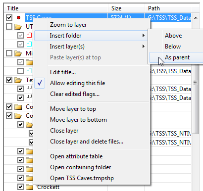 If map layers are grouped into folders and subfolders, you can expand or collapse tree branches by double-clicking. By using folders we simplify the displayed list of layers, making it much easier to control the visibility of groups of related files. Also, scale range settings can be quickly applied to an entire branch. You'll find options for creating folders in the right-click context menu for a selected tree item. Up to 8 levels of depth are supported.