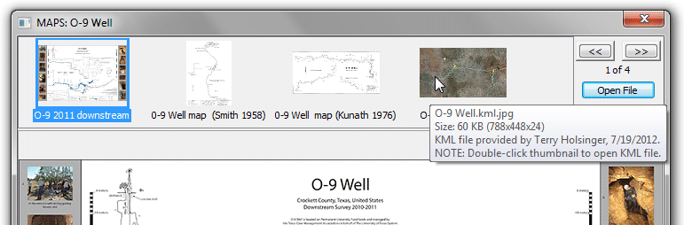 The image previewer generates thumbnails on the fly. If the original file is very large or of a type not natively supported by WallsMap, you can use a feature that's illustrated in the above example. The approach is to create a different file to actually preview, a raster image with the same name as the original file but with the true extension tacked on at the end. In this example we've loaded a KML file named O-9 Well.kml in Google Earth, took a screenshot and saved it alongside the KML file as O-9 Well.kml.jpg. When the thumbnail for the image file is double-clicked, WallsMap recognizes the double extension and opens the KML in Google Earth, the associated application. This feature works well with PDF documents and video files where the user is likely to have a default viewer. (At least for now, the associated application is irrelevant if the original file is a supported image format. In that case it's opened as a separate document within the same instance of WallsMap.)