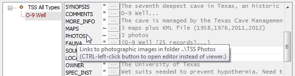 In table views and in the Selected Points window's right panel, memo fields appear as pushbuttons, with text alongside indicating the type of content. If the memo is non-empty and contains ordinary (ANSI) text, a leading portion of this text appears in gray to the button's right. If the memo instead contains rich text (RTF), the text fragment is enclosed in braces. In either case, clicking the button opens the program's text editor, one that supports both kinds of text. Active internet and local file links can be embedded in the text.