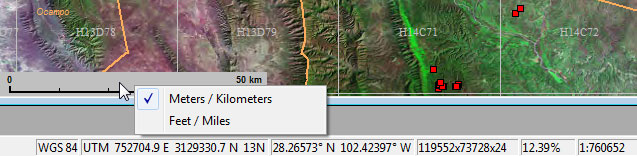 Note that map views of georeferenced data will have a scale bar. Right click on the scale bar to toggle between types of units: