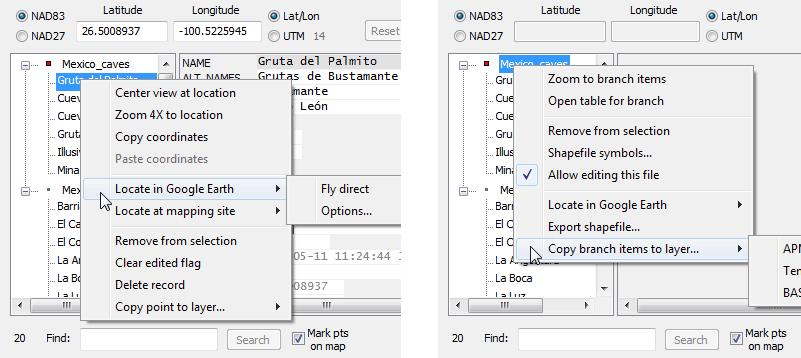 •Examine Attributes of Selected Items: When you select features using any of these methods the resizable Selected Points window will immediately open if not already open. It allows you to edit or view both locations and attributes, and also perform operations via two right-click context menus. One menu is for a selected record (below left) and the other is for all records selected in a particular shapefile (below right):