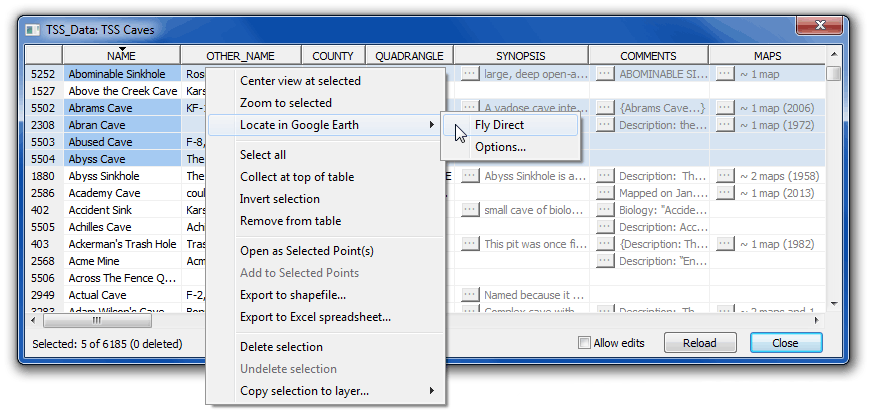 Note in particular the four export functions. You can generate a KML file for the selected records and fly directly to them with Google Earth. (The "Locate at mapping site" option isn't shown when more than one point is selected.) Similarly, you can export a new shapefile while specifying various options as described in Exporting and Merging. That topic also describes the Copy selection to layer function, which allows you to copy records to another loaded shapefile, even when their attribute structures aren't identical. Finally, the Export to Excel spreadsheet function creates an XLS file and optionally opens it with Microsoft Excel (or the associated program).