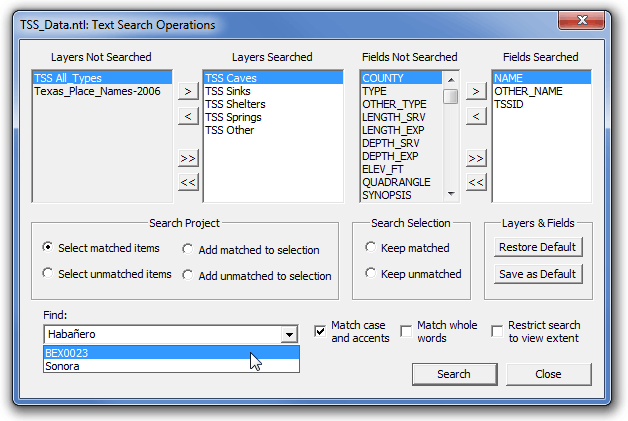 When you need a more refined search, possibly to add to the selection, click the binoculars icon in the program's toolbar. This opens the Text Search Operations dialog shown below. Hopefully most of it will be self-explanatory. If you adjust the layers and fields searched in the dialog's top half, then those settings will only affect subsequent searches from this dialog, not the quick find box described above. You can, however, use the "Save as Default" button to change the default search fields for the shapefile highlighted in the "Layers Searched" box. Also be aware that changes made in the "Fields Searched" box will only affect the search of the highlighted layer. You may need to select several layers to make adjustments. Normally a project will remain configured so that the top half of the dialog can be ignored for most searches.