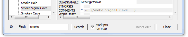 The goal of a text search operation is to fill the left panel of the Selected Points window with the list of all records whose attribute fields have text matching a target string. Once selected, you can scroll the list, highlight a particular record by clicking its label, then view or edit its attributes (right panel) and its geographical coordinates (top of window). The results from searching multiple shapefiles will be shown.