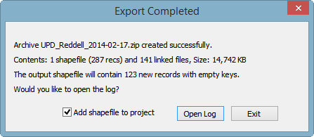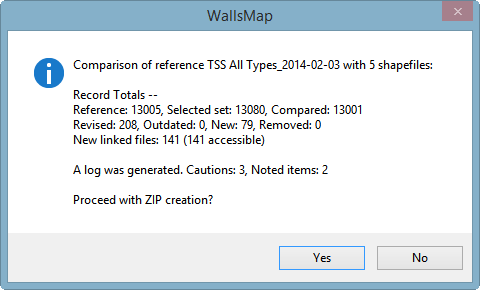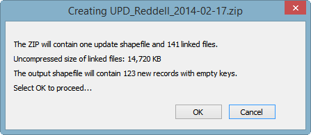 Although five shapefiles have been selected, only a single shapefile will be generated by the compare function. It will lump together all the new and revised records found in the selected set and produce UPD_Reddell_2014-02-17.shp, storing it both inside and outside the ZIP file. The only reason we're comparing the reference against multiple files is that a TSS database release contains both a complete snapshot and an editable copy of it in the form of five different map layers. At least initially, the layers are distinguished by karst feature type, but since karst type is also an attribute field value, and one that can be edited, the particular source shapefile of an updated record is of no concern to the person processing the update.