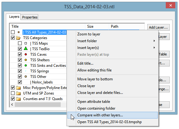 In this example, the shapefiles of interest are five visible ones grouped under folder TSS Categories. They aren't required to have these names, nor must they reside in the same disk folder. They should, however, be stored in a folder where their file links are valid, allowing the retrieval of any new files for the archive. Before initiating a comparison, make sure that these shapefiles have checked visibility boxes. That allows them to appear in the dialog that opens when you select Compare with other layers: