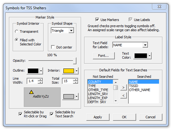Default Fields for Text Searches - These are the attribute fields examined when you perform a text search via the lower-left Find box in the Selected Points window. They are also the search fields used to initialize the Text Search Operations dialog. (Within that dialog you can make changes that only affect searches done from there while the project is open.) Upon layer addition the program makes searchable only the first non-memo attribute field, although memos are also searchable. The Selectable by Text Search box is also initially checked. If you uncheck it, the layer won't be examined in a text search regardless of the search field settings.
