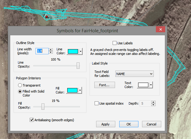 Like a point shapefile, polygon and polyline shapefiles also have a Symbols dialog for controlling appearance, one that's accessed via the same button in the Layers Window's right panel. Some of the controls are the same or similar to those in the corresponding dialog for point features. One significant difference is the lack of predefined text search fields. That's because only point features are candidates for the Selected Points window, even though text searches are supported for all shapefiles in table views. Another difference is that this dialog has separate fill and outline opacity settings for polygons. Finally, while markers for points always have smooth outlines, there's an Antialiasing option for the lines and edges that you'll normally want to enable. Upon layer addition it's disabled.