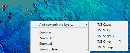 With the project set up this way, it's easy to add new records and to edit existing records. To add a shelter, for example, just right-click the map view at the approximate location of the shelter and choose the appropriate shapefile target. The possible targets presented will be point shapefiles that are both visible and editable: