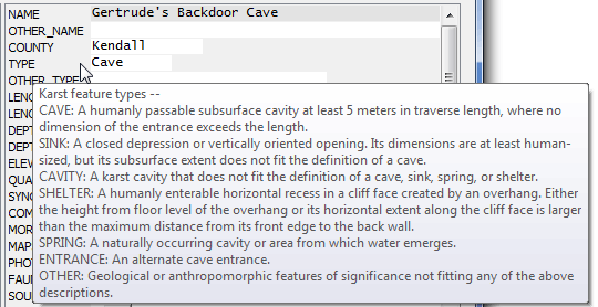 For a summary of the information stored in the database for each karst feature, see Database Field Descriptions.