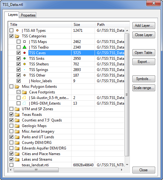 The TSS_Data project is a mixture of several useful geographical datasets, including the essential karst shapefiles. Its various components (layers) will appear similar to what's shown below when the Layers/properties window is opened: