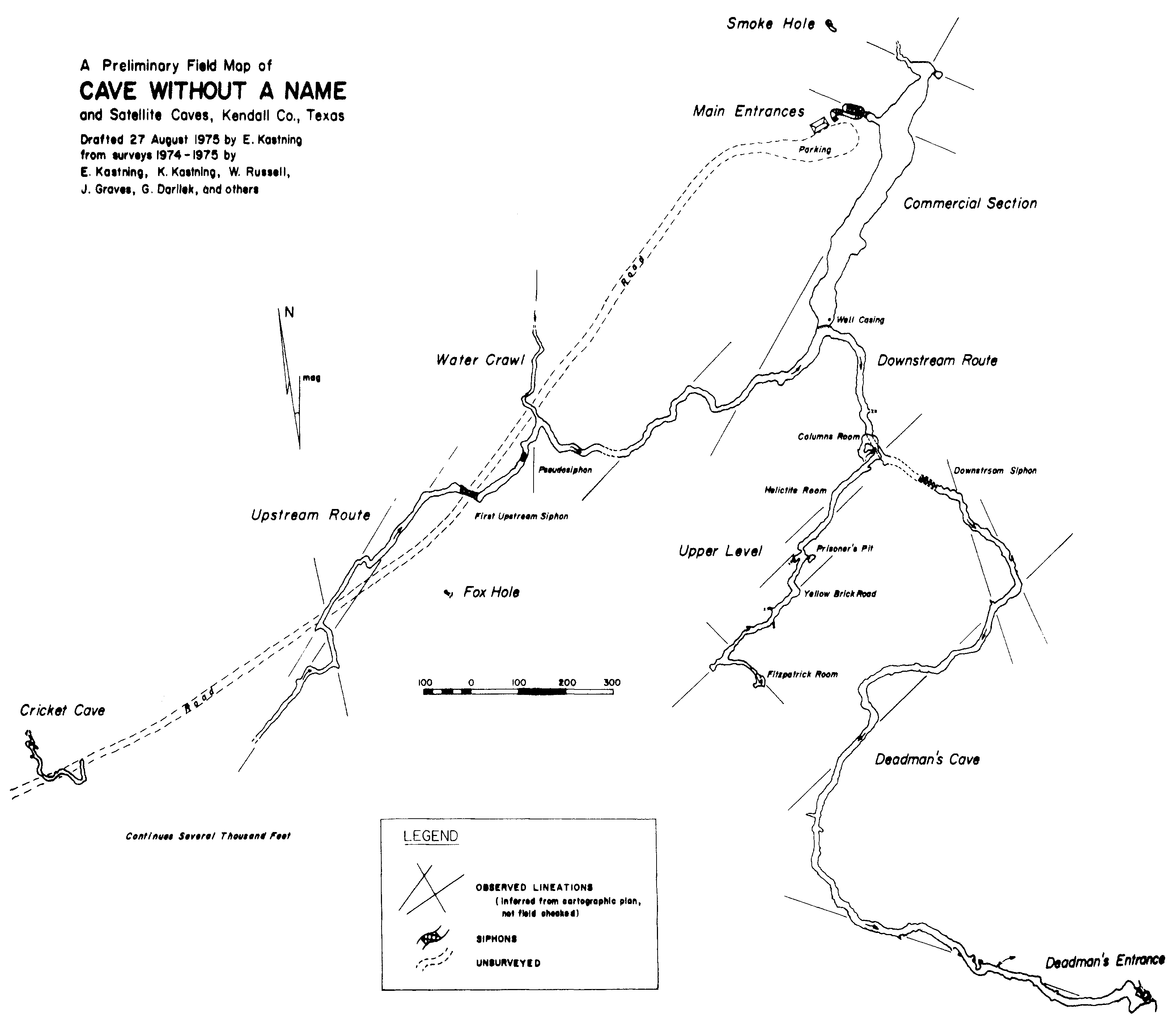 Directions: On the outskirts of San Antonio, exit on 1604 (Anderson Loop) and head to Interstate 10. Take "IH 10 West" (although you'll be heading north), go about 18 miles, take the first exit for Boerne (Highway 87), and follow the road into town. When you reach the fourth traffic light turn right onto 474. Follow the road out of town for 6 miles, turn right onto Kreutzberg Road, and then follow the signs for 5.3 miles to the cave Description: Cave Without a Name has a short trail but is a wonderful cave. A staircase spirals down a pit and opens into a 7-m-high by 12-m-wide passage decorated with large speleothems. The trail ends after 186 m at a large stream passage. Cave Without a Name is Texas' best kept secret among show caves. The lack of advertising and the slightly off-the-beaten-path location belie the cave's quality. Its entrance pit has been enlarged to accommodate a staircase that spirals down to a depth of 24 m. The pit opens into a passage measuring 186 m long and averaging 7 m high by 12 m wide. Large columns, stalactites, stalagmites, and draperies divide the passage into four distinct sections. The speleothems include some of best rimstone dams and cave bacon in Texas. The tour trail ends at a stream passage where the real caving begins (sorry, no off-trail trips since the owners get their drinking water from the stream). Downstream the cave extends 100 m to a 10 m long sump, then continues about 560 m to the Deadman's Cave entrance. Upstream, the cave has been surveyed nearly 3 km through several sumps requiring scuba. The stream passage is usually 3-5 m high and wide, and filled waist to neck-deep with water. Several sumps and side passages await exploration. The cave was discovered in the early part of the 20th century when steam was seen rising from the pit entrance one cold winter morning. A rock that partially covered the pit was moved, but no one went into the cave until the 1920s when it was necessary to rescue a goat. In 1927, a group of boys dug open a short crawlway at the base of the entrance pit and found the main part of the cave. Between this discovery and its commercialization, the cave's entrance area hid a moonshine still during prohibition years. Significant exploration of the stream passage required scuba and was not accomplished until the 1970s. Cave Without a Name has operated as a show cave since 1939, when a contest to name the cave was won by a local youth who felt the cave was too pretty to have a name. For a few years in the 1970s the cave was called Century Caverns before reverting to its original name. The cavernicole fauna of Cave Without a Name, as in other nearby caves, is poorly studied. Nonetheless, preliminary collections from the cave yield a diverse assemblage of aquatic and terrestrial animals that include, snails, isopods, amphipods, crayfish, spiders, harvestmen, millipeds, springtails, cave crickets, beetles, salamanders, frogs, and bats. Further study promises the Cave Without a Name area to be biologically rich and interesting. Cave Without a Name is one of several extensive stream caves in the lower member of the Glen Rose Formation that drain to the Guadalupe River. Recent research indicates that while these caves drain local uplands, the main passage of most major caves is formed by pirating water from the river and returning it some distance downstream. Some caves obviously cut across river meanders, while others like Cave Without a Name follow more obscure routes. The pit entrance to the cave has formed relatively recently as indicated by Late Pleistocene bones found at its base (see the paleontology chapter by Toomey in this Guidebook). Bibliography: Ebell, Eugene. 1992. Personal communication. Former owner of Cave Without A Name. Elliott, W. R. 1985. A field guide to the caves of Kendall County. Texas Speleol. Surv., pp. 22-23& 66-76. Fieseler, R. G., J. Jasek, and M. Jasek. 1978. An introduction to the caves of Texas. NSS Conv. Guidebook. 19, p. 104. Semken, H. A., Jr. 1959. Preliminary report on the Cave Without A Name fossil fauna. Texas Caver, 4(3):6. Texas Speleological Survey. 1991. Report on the 60 longest and deepest caves. Texas Caver, 36(6):122. Veni, G. 1994. Geomorphology, hydrogeology, geochemistry, and evolution of the karstic Lower Glen Rose Aquifer, South-Central Texas. Ph.D dissertation, Penn. State Univ., University Park, 721 pp.