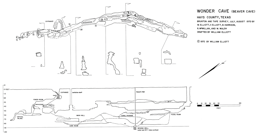 Directions: Take IH 35 to San Marcos and watch for the Wonder World signs on the south side of town. Description: Wonder Cave is unusual in that it is formed along a fault in the Balcones Fault Zone. The cave is historic but has relatively few speleothems. The smallest and oldest, continuously operating of the seven show caves in Texas, Wonder Cave was originally called Bevers Cave after Mark Bevers, who discovered it in 1896. A.B. Rogers bought it and opened it to the public some time prior to 1915. It is now part of the Wonder World theme park. The cave is an almost straight crack in the Edwards Limestone but the walls have been modified by water and parts of the fissure are filled with breakdown. Small speleothems are found in some areas. Beaver's Well is about 28 m (93 ft.) deep from the surface to the water. Troglobites such as Typhlomolge rathbuni (Texas blind salamander), Palaemonetes antrorum (blind shrimp), and Cirolanides texensis (blind isopod) were found in the cave's water at one time but have not been seen recently. These species are also found in nearby Ezell's Cave and in the San Marcos Pool of the Edward's Aquifer. The 1970 survey covered most of the cave's three levels. There probably is some additional, unsurveyed upper level passage between the ventilation shaft and the big dome in the Main Hall. There are rumors of a lower level stream and an extensive upper level. The Crystal Palace is nicely decorated but is no longer on the tour. At the end of the tour an elevator takes visitors to the surface. If you have bought a combination ticket, you continue to rise another 30 m to the top the Texas Observation Tower where you can get a fine view of the Texas Hill Country from a glassed-in platform. Bibliography: Craun, V. S. 1948. Commercial caves of Texas. Bull. Natl. Speleol. Soc., 10:33-45. Elliott, W. R. 1970. The Wonder Cave survey. Texas Caver, 15:192-193. Gurnee, R., and J. Gurnee. 1990. Gurnee Guide to American Caves. R.H. Gurnee, Inc., Closter, New Jersey. 288 pp.